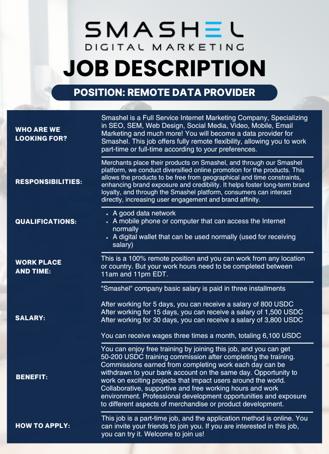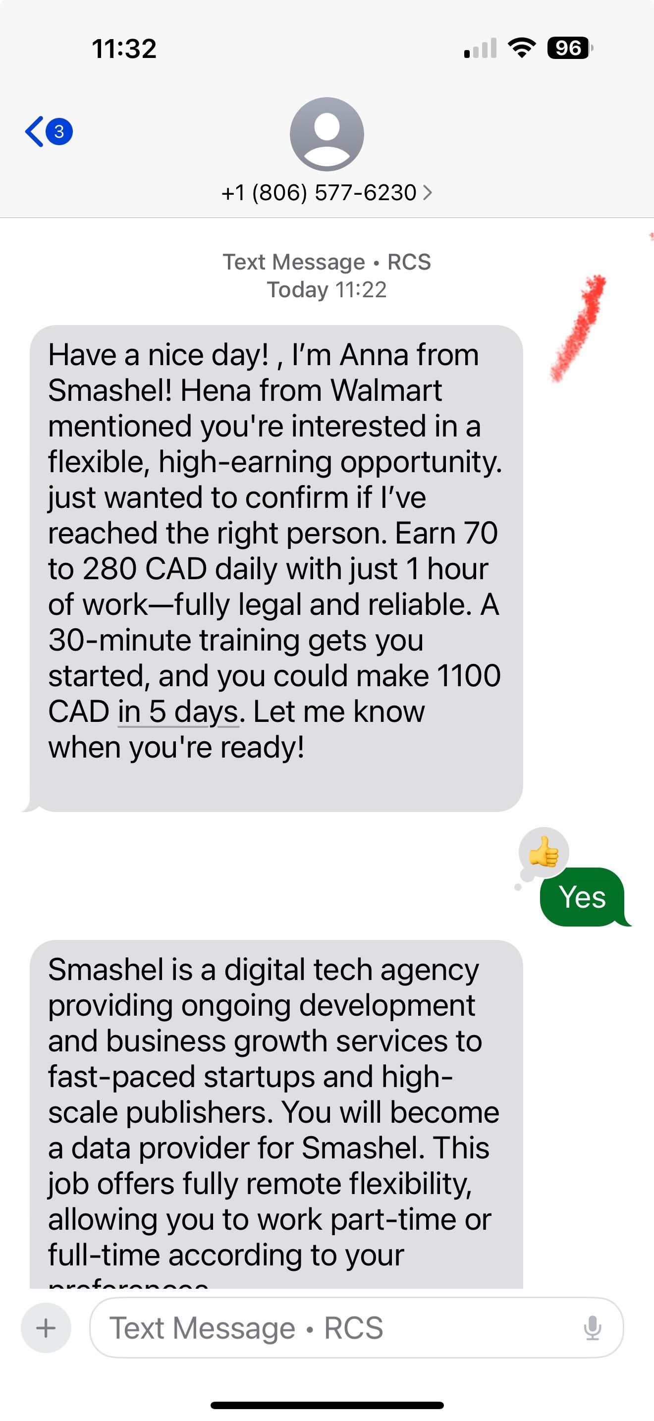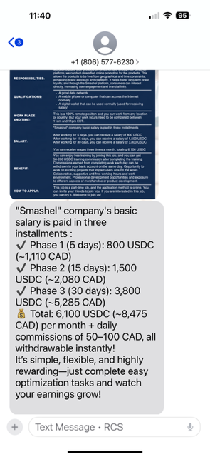 We’ve been made aware of a fraudulent text message and job posting claiming to be from Smashel Digital Marketing. These messages offer remote "data provider" jobs with promises of high earnings in USDC or CAD and request your personal information.